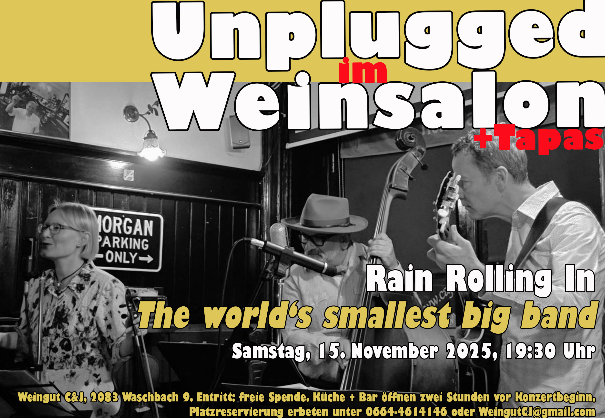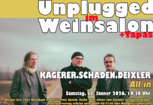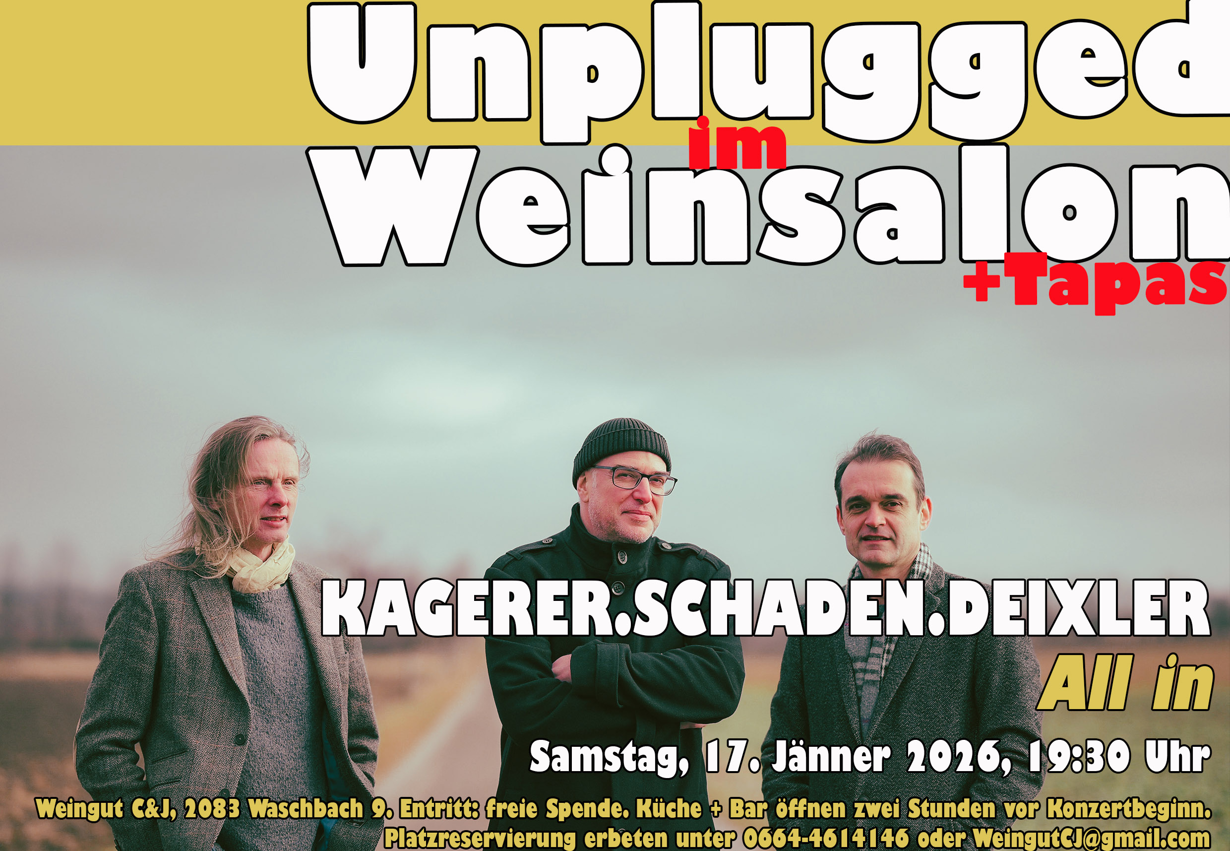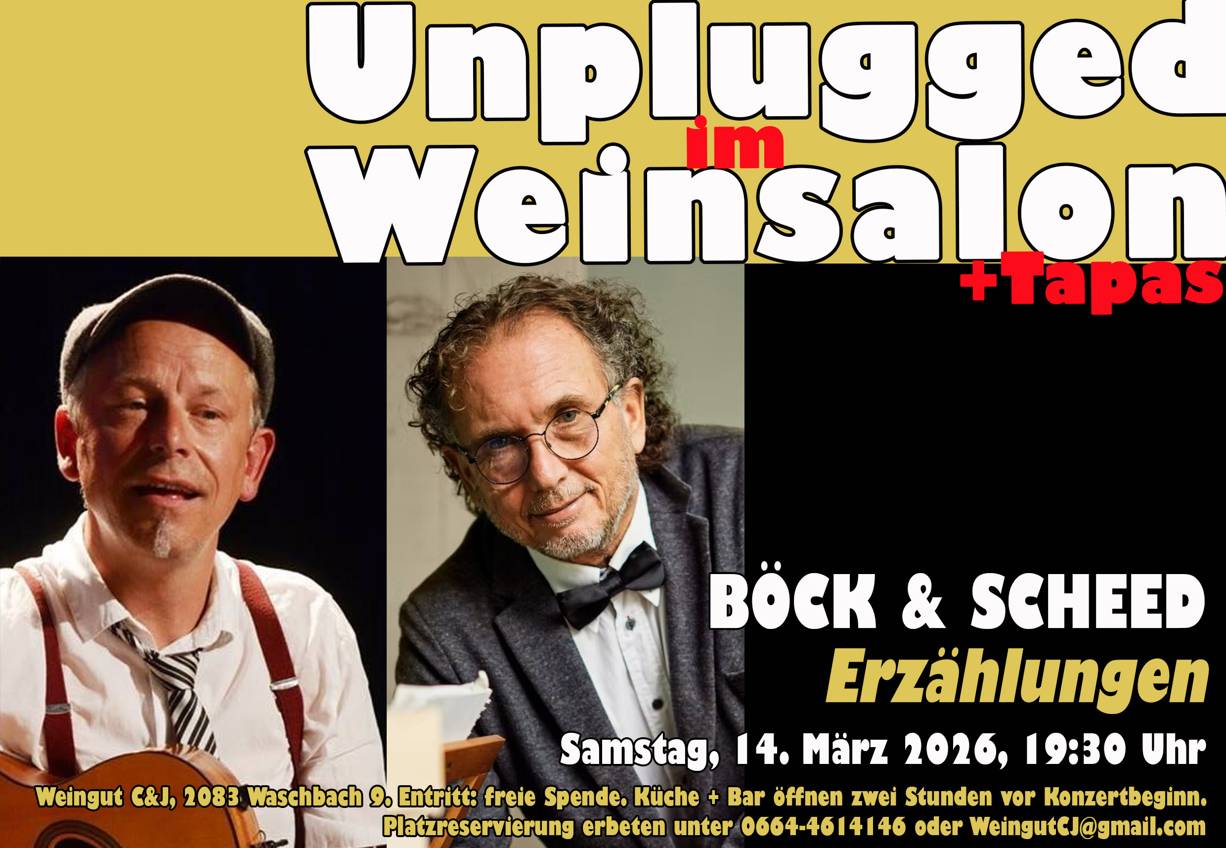 Termine Datum Veranstaltung Ort Info 15. November, 19:30 Uhr Unplugged im Weinsalon: Rain Rolling In / The world’s smallest big band Weingut C&J, 2083 Waschbach 9 14. Dezember, ab 14 Uhr Offene Kellertüre + Tapas Weingut C&J, 2083 Waschbach 9 17. Jänner, 19:30 Uhr Unplugged im Weinsalon: KAGERER.SCHADEN.DEIXLER / All in Weingut C&J, 2083 Waschbach 9 21. Februar, 19:30 Uhr Unplugged im Weinsalon: John Dellroy Band/ A new life has begun Weingut C&J, 2083 Waschbach 9 14. März, 19:30 Uhr Unplugged im Weinsalon: Böck & Scheed/ Erzählungen Weingut C&J, 2083 Waschbach 9