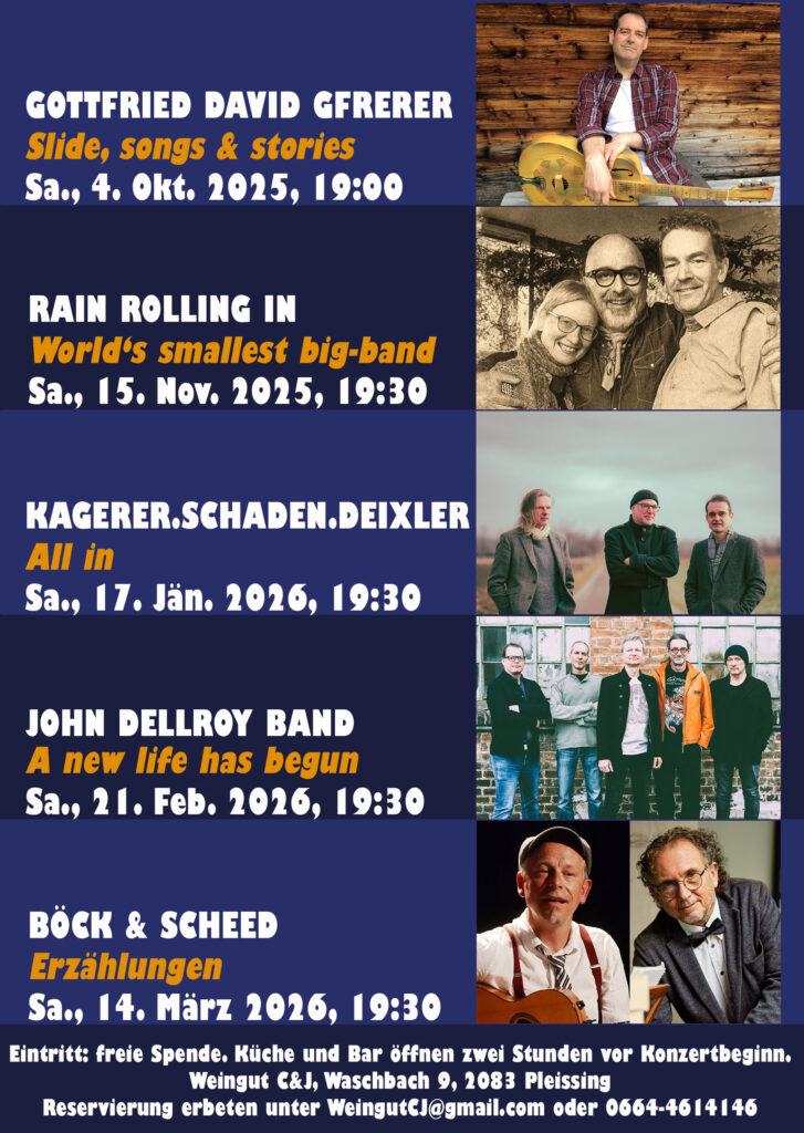Musik, Literatur oder Kleinkunst neben der Gaumenfreude – oder ist es eher umgekehrt? Wie dem auch sei: die kalte Jahreszeit möchten wir nutzen, um, in gemütlicher Atmosphäre, etwas mehr als EssKULTUR und WeinKULTUR anzubieten. Für den ersten Spielplan konnten wir Gottfried David Gfrerer, Rain Rolling in, Kagerer.Schaden.Deixler und das Duo Böck&Scheed gewinnen, unserseits wird es wiederum edle Tapas sowie eigene Weine und ausgewählte Schätze aus unserem Keller geben (hier geht es zur Weinkarte).